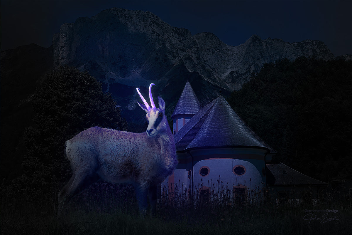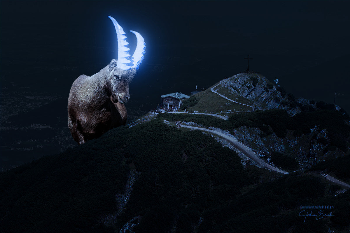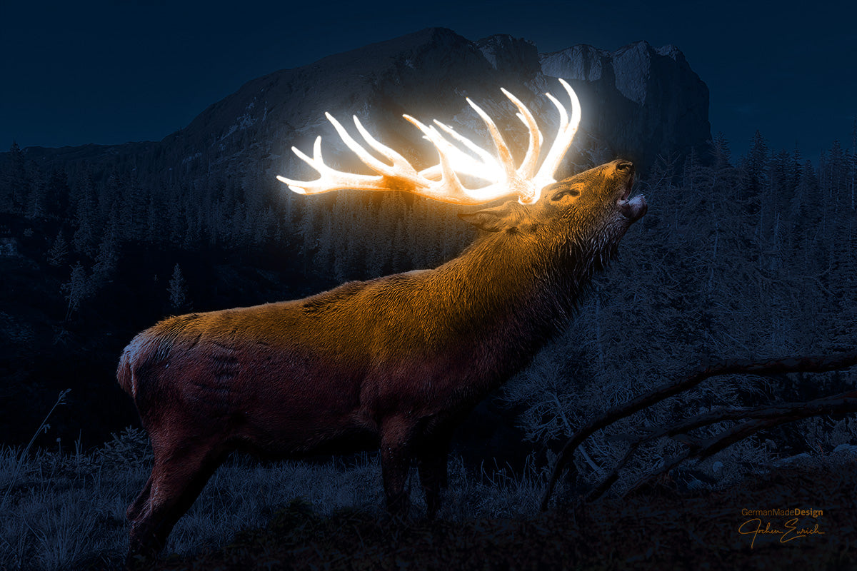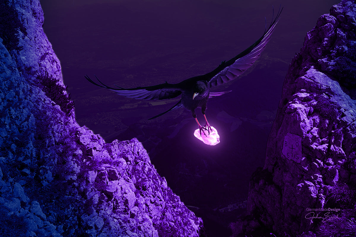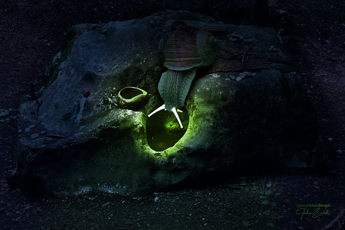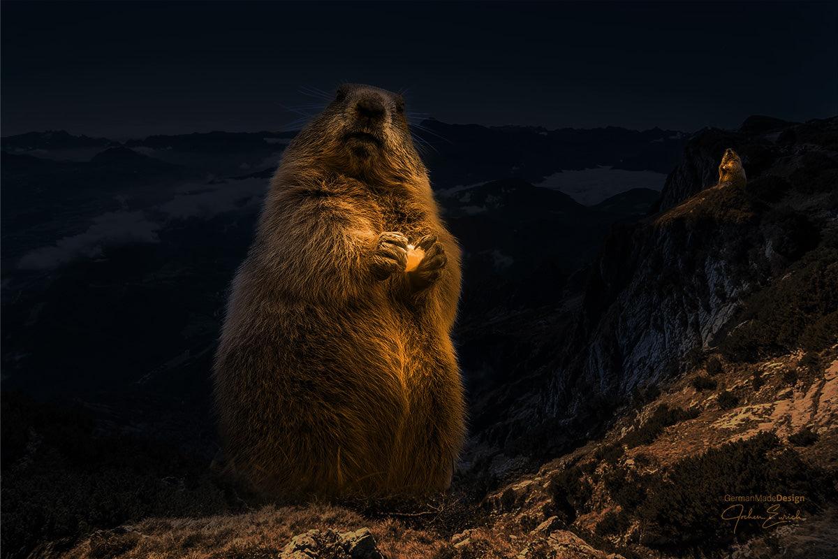 Magisches Eichhörnchen glühend leuchtender Stein der Macht, kraftvolle und mystische Stimmung bei Vollmond am Fuße des Untersberg. Als überdimensionales Geistwesen wachend und Träger des gelben Lichts der Macht.