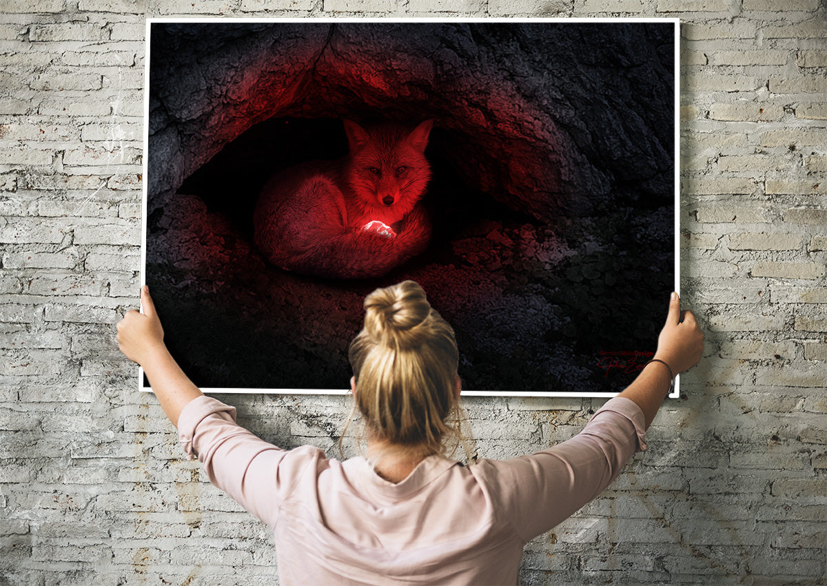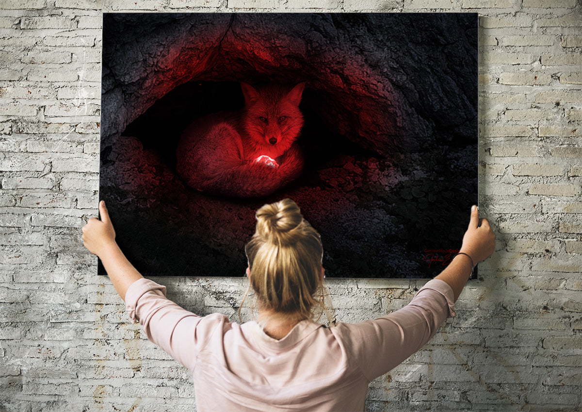 Magischer Rotfuchs glühend leuchtender roter Stein der Macht auf dem Untersberg, kraftvolle und mystische Stimmung bei Vollmond am Eingang der Höhle Steinkaser in der Mittagsscharte auf dem Untersberg. Als überdimensionales Geistwesen wachend über den roten Stein der Macht.