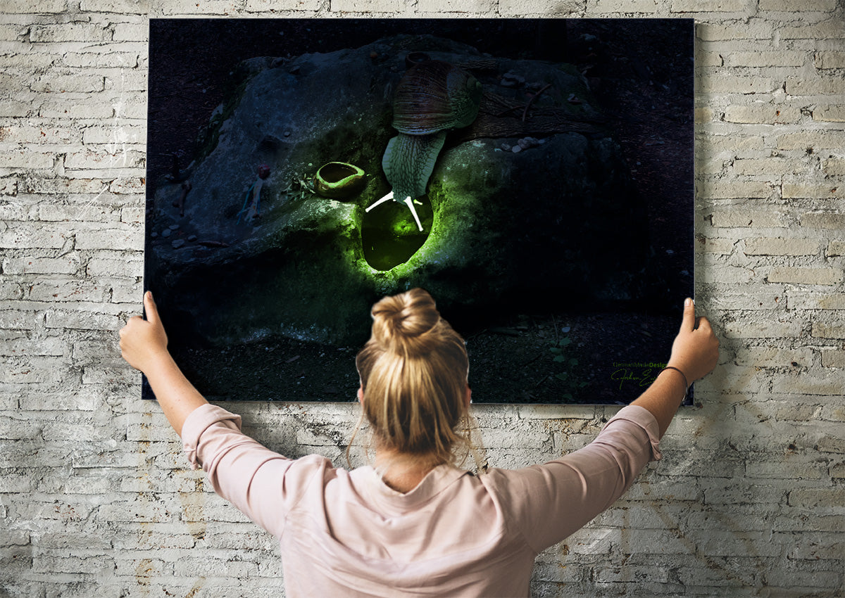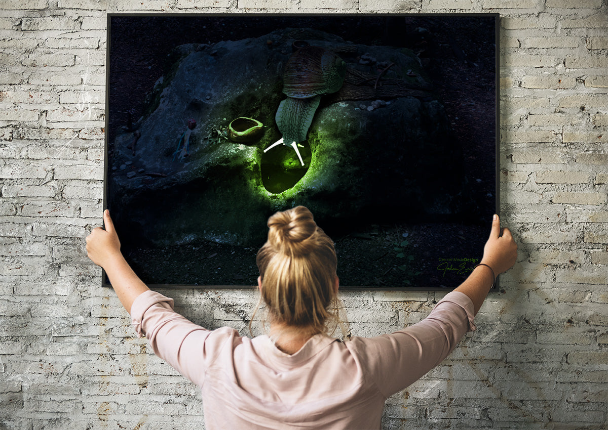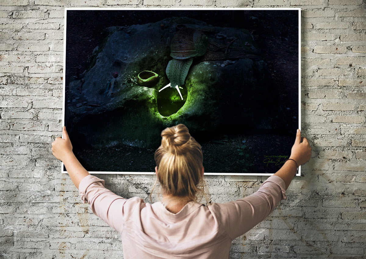 Magische Schnecke glühend leuchtende Fühler, kraftvolle und mystische Stimmung bei Vollmond am Herzstein am Fusse des Untersberg. Als überdimensionales Geistwesen wachend und Hüter des grünen Lichts der Macht.
